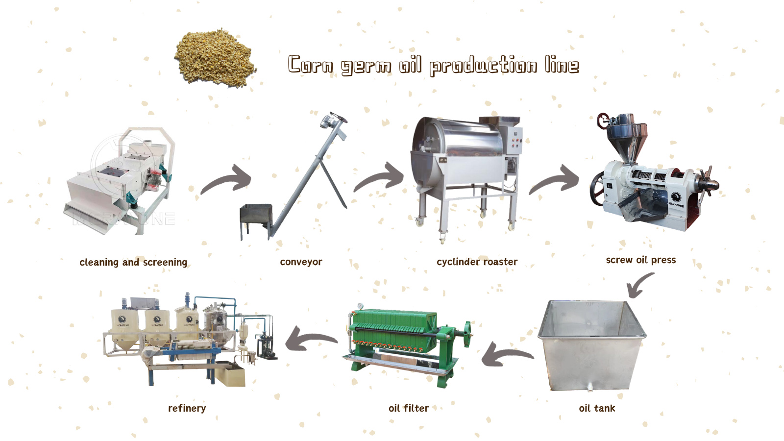 El germen de maíz tiene un alto contenido de almidón. Durante el proceso de producción de aceite, la presencia de la cáscara (cuyo componente principal es el almidón) afecta el rendimiento y la calidad del aceite. Por lo tanto, es fundamental prestar especial atención a la limpieza en la sección de prensado, separando el endospermo y la cáscara en la medida de lo posible.