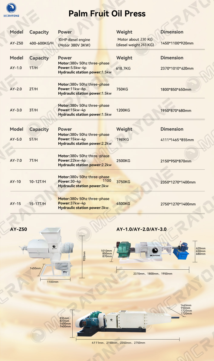 La Prensa de Aceite de Palma de nuestra empresa MCRAYONE, AY Series está diseñada específicamente para la producción de aceite de palma. Es sencilla de operar, fiable en su rendimiento y le ayuda a producir aceite de palma de alta calidad sin experiencia profesional.