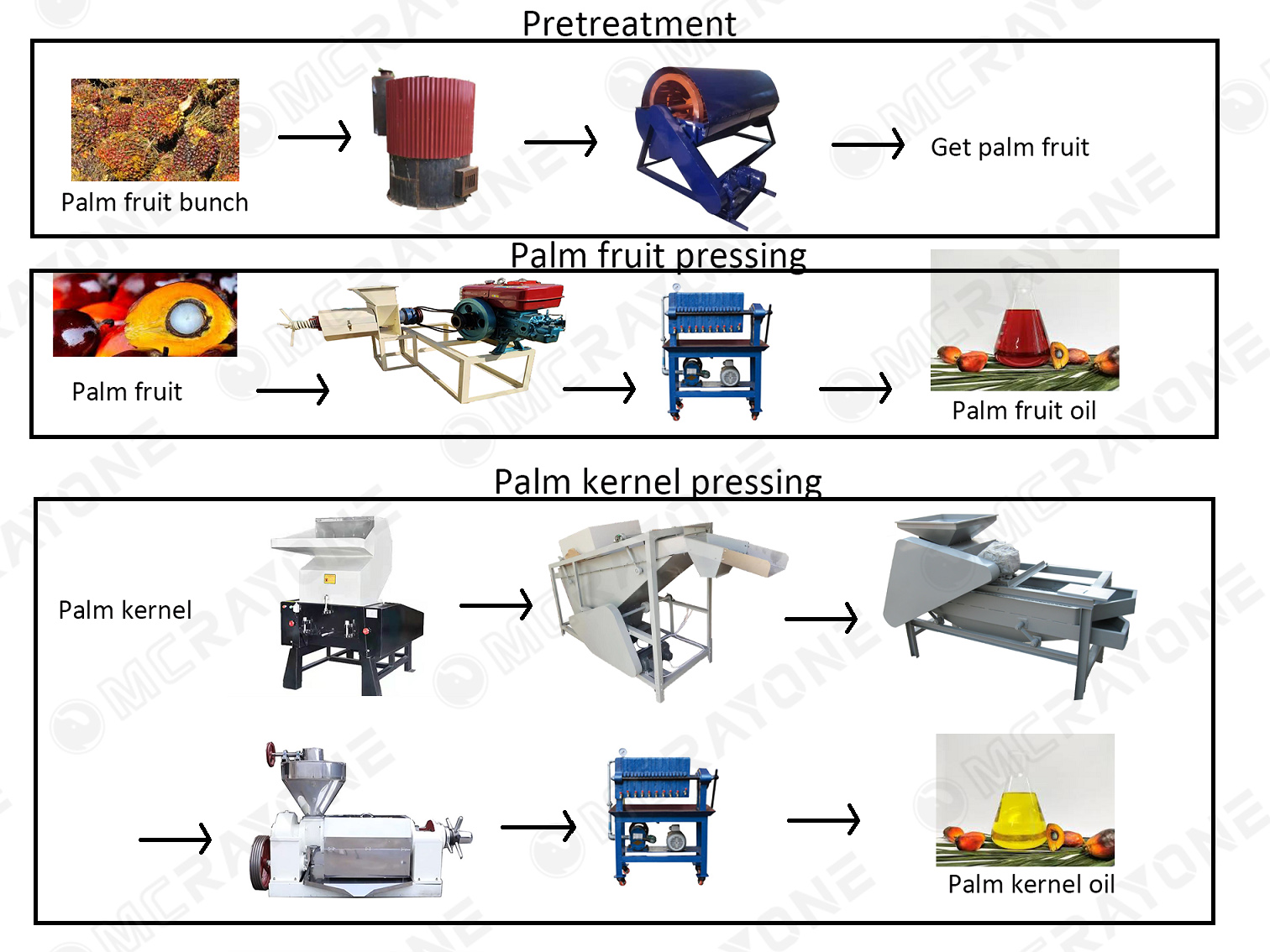 Para el prensado del fruto de la palma, ofrecemos una máquina de prensado de aceite de fruto de palma específica, diseñada para el mesocarpio fibroso, que proporciona una alta producción de aceite, es fácil de operar y resulta ideal para la producción de aceite de palma a pequeña y gran escala.